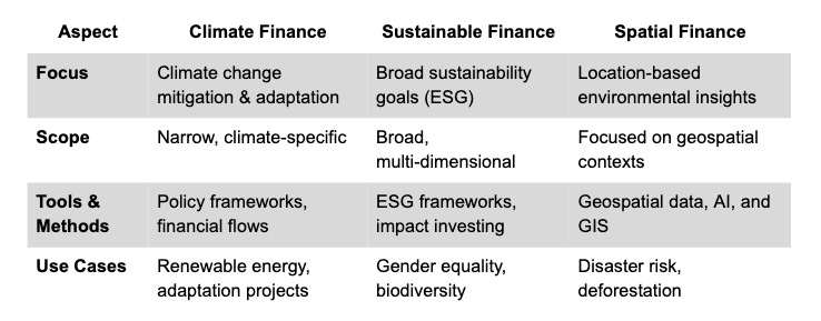 While Climate Finance is narrowly focused on addressing the climate crisis, Sustainable Finance uses a much wider lens, considering diverse environmental and social challenges. Spatial Finance acts mainly as the connective tissue, providing geospatial insights that add needed color to both Climate and Sustainable Finance strategies.